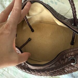 Beautiful vintage Bottega bag. Soft lamb skin leather. In excellent vintage condition except for one small mark on the inside of the bag (circled). Super chic, only worn a few times and kept in a dust bag. This is an authentic item. No Bottega dust bag or box because it’s vintage.