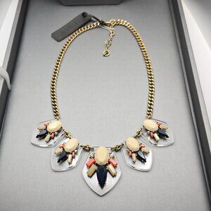 This J.Crew statement necklace features a striking Art Deco style design with multi-color acrylic embellishments on a lucite shield. The gold-plated curb chain adds a touch of elegance, making it suitable for various occasions. The combination of colors and bold design ensures it stands out, making it a unique addition to any jewelry collection.