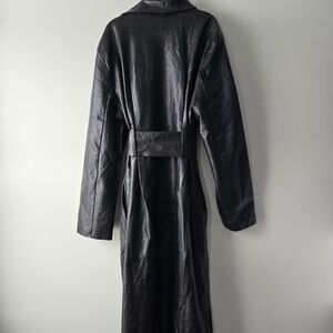 Shell is 100% polyurethane, lining is 100% polyester. Long faux leather trench coat. Black with almost gray undertones. Adjustable belt. Zip and snap button closure. Still has tags. Size 14. Has a tall, slim fit.