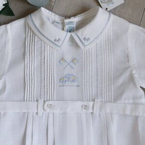 This Baby Boy's White Heirloom Romper/Creeper is a SPECIAL FIND!! The RARE DESIGN is no longer in commission, making this a little treasure! The romper is done in a White poly/cotton blend for easy care and durability (and less wrinkles). The point collar has light blue(with a touch of yellow) embroidered racing flags on each side. A matching white trim is hand-faggoted to the collar in Blue stitching. The short sleeves are cuffed and have a pleat at the center. Matching faggoted stitching adorns the cuff of the sleeves. The chest is adorned with rows of vertical pintucks with a blue shadow embroidery Race Car and Racing Flags at the center, both having yellow accents. The centera of the pintuck rows have Boring down the center. Belt loops keep a belt in place. Inseam snap for easy changes. Timeless and Classic!! Perfect for your sweet boy's special occasion. Also great for portraits, weddings, parties, church or vacation dinner. New With Tags!