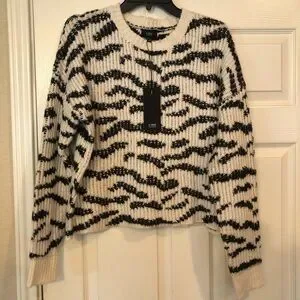 Soft, mid-weight intarsia knit Zebra stripe pattern Crew neck and long sleeves Waist-length pullover with ribbed trim Shell: 48% cotton/28% acrylic/9% polyester/7% nylon/5% alpaca/2% wool/1% spandex Dry clean Imported, Measurements: