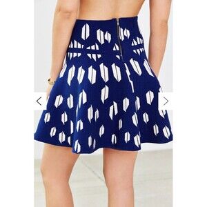 New with tags! JOA Los Angeles sweater skirt in womens size small, please see measurements below. Deep royal blue base with white geometric pattern. Wool blend with stretch! Tight knit, flare style, zip closure in back. In excellent new condition.