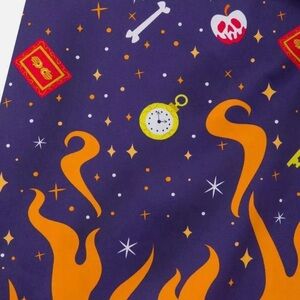 • Allover pattern of polkadots, orange flames, pumpkins, eyes, bones, dice, stars, watches, keys and potion books. Of course, the three famous witches from the movie.