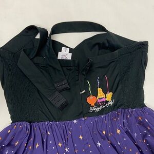 Tonight, you'll fly in style wearing this bewitching dress inspired by the 1993 fan favorite Hocus Pocus. Conjure compliments with the Sanderson Sisters in tow on the skirt of this halter top dress featuring a embroidered accents in back.