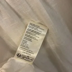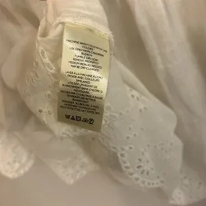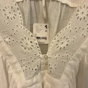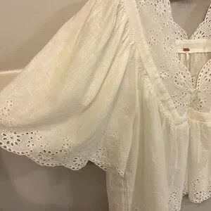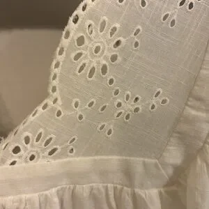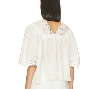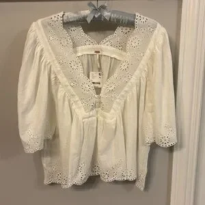 Elegant white blouse with eyelet detailing. Features scalloped edges and puff sleeves. Perfect for a chic look.