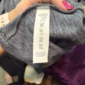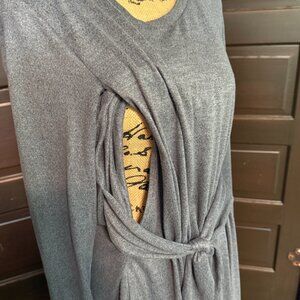 I can't even describe how soft and comfortable this material is. It's warm and cozy, but lightweight. You can easily breastfeed your baby with the discreet side access. The tie around the waist is flattering especially if you're a little self-conscious about your mommy tummy. The color is a gorgeous charcoal. Snag this and nurse your baby in comfort and style. Great condition. Comes from a smoke-free, pet-free home.
