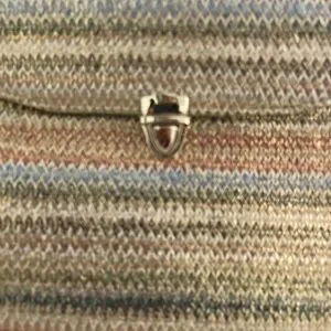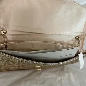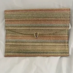 Stylish woven clutch featuring a multicolor design. Includes a secure gold clasp.
