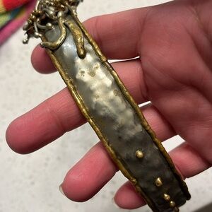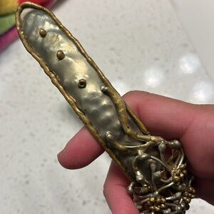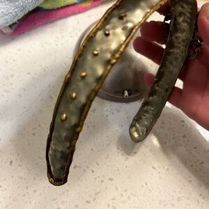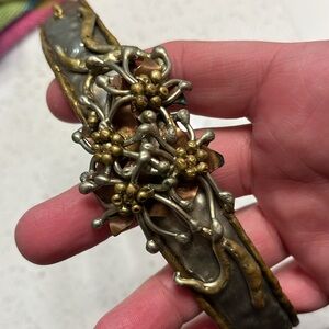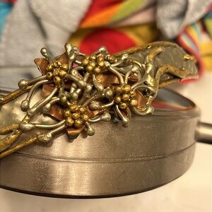 Stylish metallic headband featuring intricate floral accents. Perfect for adding a touch of elegance to any outfit.