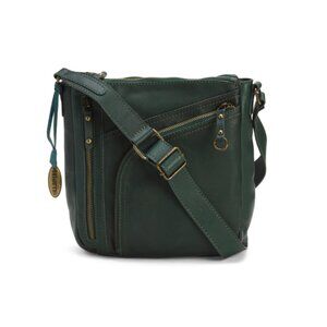 three compartment design, embossed brand logo, removable charm, pebbled finish, adjustable crossbody strap, antique brass tone hardware