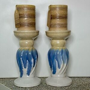 Blue Glaze Ceramic Candle Holder. Set of 2. 8-1/2” tall. Holds a 3” pillar candle as shown. Candles not included. Blue, white and tan. In great shape.