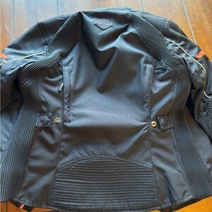 Dynamic black jacket with striking orange details. Perfect for performance and style. Embrace the Harley-Davidson spirit.