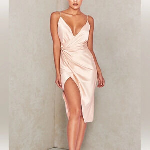 House Of CB Coco Beige Nude Satin Drape Back Dress Cowl Wrap Midi