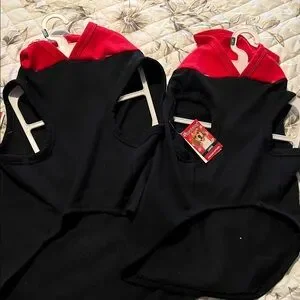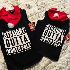 Playful Christmas outfits for pups. With “Straight Outta North Pole” writing and red hoods with Pom Pom. Available as set or separately. I have size large and XL.