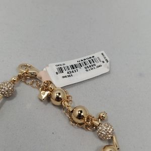 Beads: The Necklace is made with two types of beads: 18 smooth, gold-toned spherical beads and 6 pave-style spheres completely covered in small, clear rhinestones. The beads are arranged in a repeating pattern.