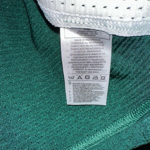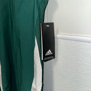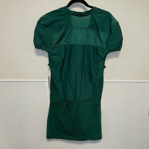 New with tags, this Adidas football jersey is size Medium. It's dark green with white accents on the sides and V-neck. The material is a polyester blend, appearing lightweight and breathable. The Adidas logo is embroidered on the chest. Shoulder pads are integrated. Measurements are not provided. No visible imperfections. The tag indicates it's an officially licensed product, made in Nicaragua.