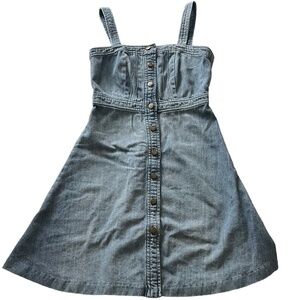 Gap Women's Denim A-Line Mini Dress. Size 0. Medium blue wash with slight distressing. Full button down front. Adjustable shoulder straps. Approximate measurements as pictured. 100% cotton. Machine washable. Good used condition.