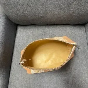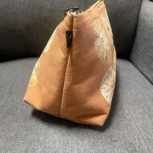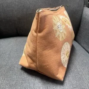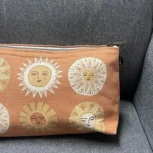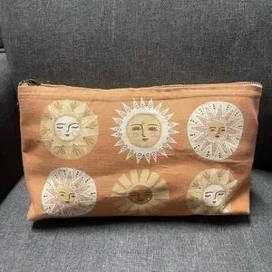 Chic pouch with sun designs. Features a secure zipper. Ideal for storing essentials.