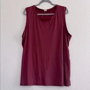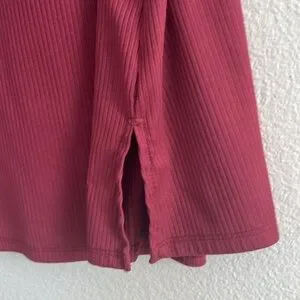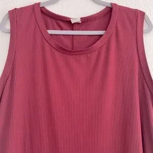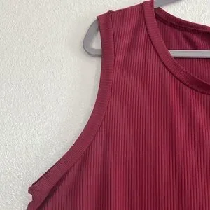 This burgundy/wine colored tank is a soft,ribbed fabric with small slits on the sides. It was washed and worn a few times but is in great condition showing just very minor wash wear. It measures about 25” from underarm to underarm and about 30” in length.