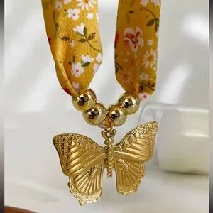 Elegant gold butterfly pendant necklace featuring a vibrant yellow floral scarf. Perfect for adding a touch of sophistication to any outfit.