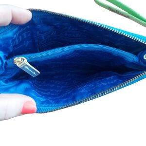 This vibrant Lilly Pulitzer clutch showcases a lively pattern with swirling designs in shades of pink and blue, perfect for a fun summer look. Made from smooth material, it features a zippered closure and a bright green wrist strap for added convenience.