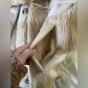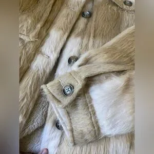Chic faux fur jacket with button closure. Features dual chest pockets. Soft and stylish for cool weather.