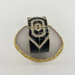 Elegant black enamel and gold tone bracelet with geometric design and sparkling rhinestones.