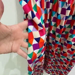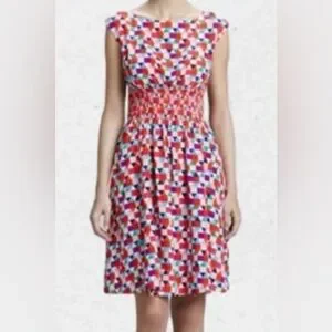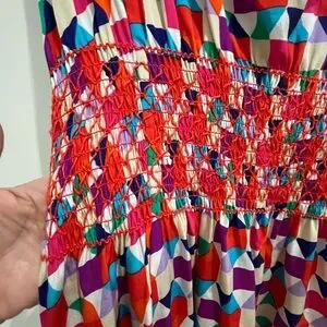 Vibrant midi dress with geometric patterns. Features a fitted smocked waist and flattering design. Ideal for lively occasions.