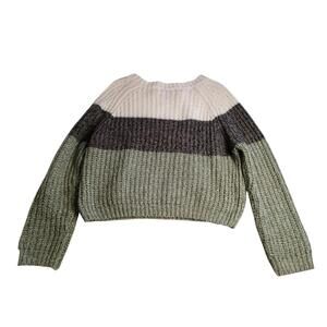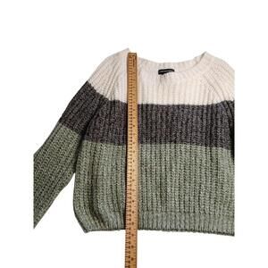 EN : Streetwear Society knit sweater, white, grey, and green wide stripe pattern. Comfortable regular fit, 100% acrylic. Excellent condition. Pit to pit: 21 in | Length: 20.5 in.