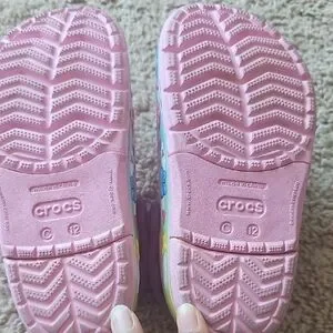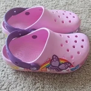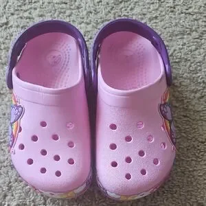 Fun pink sandals with purple accents. Perfect for playtime. Easy to slip on and off.