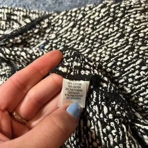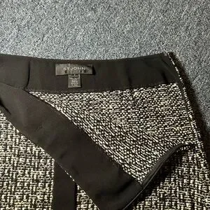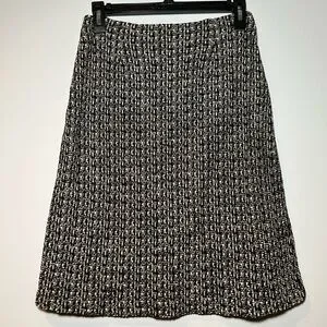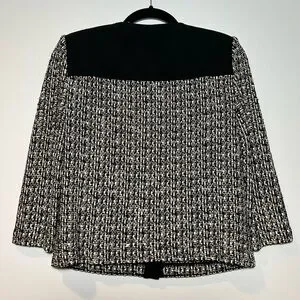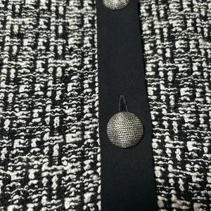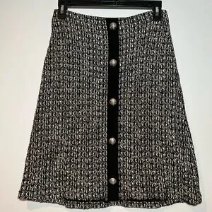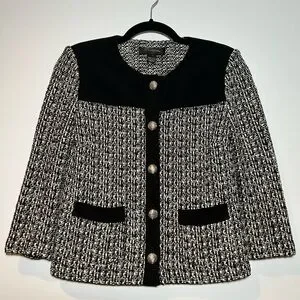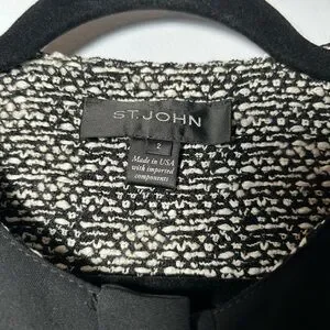 Incredibly chic classic black and white tweed skirt suit from St. John. Complete with front pockets, silver metal dome buttons and light shoulder padding.