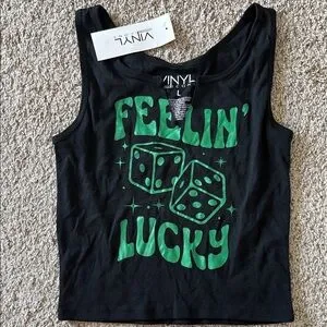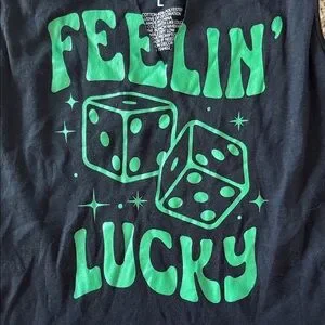 Black tank top with green 'Feelin' Lucky' graphic and dice design. Sz Large in juniors (I believe) PTP 16. Could work for S/M women’s sizing. Brand new
