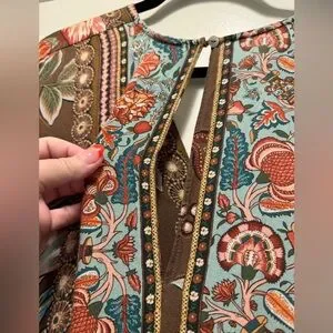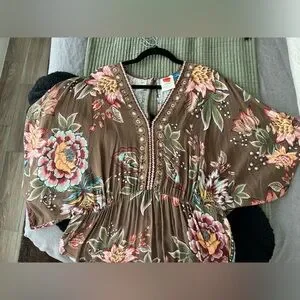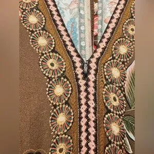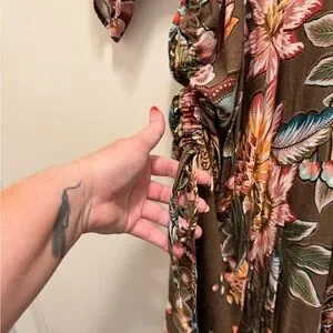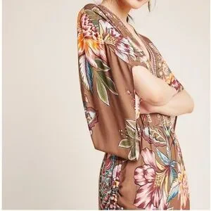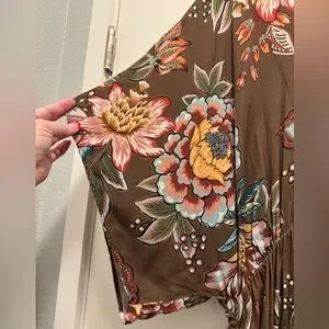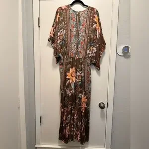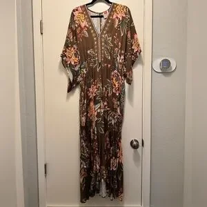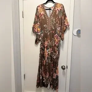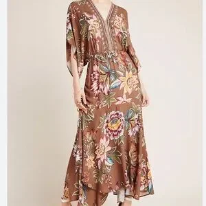 Elegant brown maxi dress with vibrant floral patterns. Features a V-neck and flowing silhouette. Perfect for any occasion.