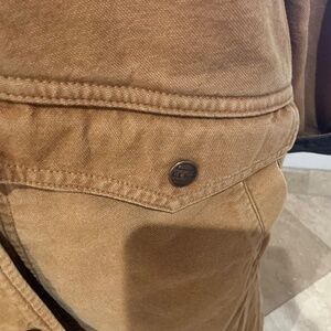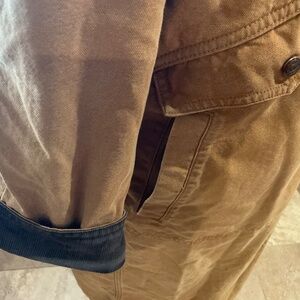 Wonderful jacket if function and not perfection is your goal. Snap down front, snap large pockets and snap to very back. This was a very loved coat and has small tear to front lower (see last picture) Please view all picture and happy to answer questions. Size has worn off, but is a small. I took a separate picture of lining for viewing, but will button in before sending. Has been laundered and from nonsmoking home. All snaps and buttons present and working. Very lower back has a slit that is buttoned, but can undo for horseback riding, etc. Great for ranch or someone who likes the old west.