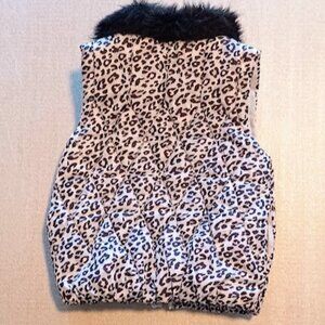 FLAPDOODLES girls NEW puffed leopard vest Size 6 with full zip, gray, black, pink w/black faux fur around collar and side pockets slight elastic gather at hem. 100% polyester, 17-inch long from shoulder to bottom hem. NEVER WORN