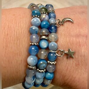 Set of three gorgeous agate bracelets on with moon and star charms Blue Agate bracelets with calming gemstones and silver accents. blue shades with some white and grey adds to the beauty of this bracelet stack!