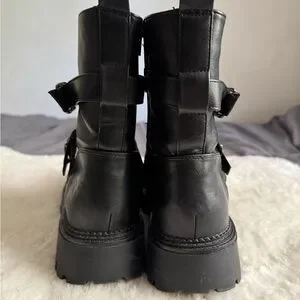 Bold black combat boots with sturdy buckles. Rugged sole for traction. Stylish and versatile.
