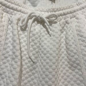 These athletic style shorts feature a clean white design with a comfortable elastic waistband and drawstring tie.