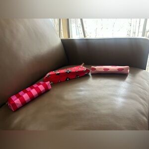 Trio of Estee Lauder cosmetic bags. Features a vibrant red bag with fun designs, a pink bag with bold stripes, and a pink bag adorned with lip prints. Ideal for makeup organization. Estee Lauder Eyes, Hearts, Lips Wing Lipsticks and Kisses 3 Cosmetic Bags 💕♥️🫦Set of 3!