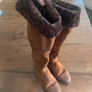 Step out this fall in style with these elegant Born brown suede knee-high boots. Can be worn turned up over the knee or folded down to reveal beautiful, soft animal print lining.