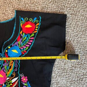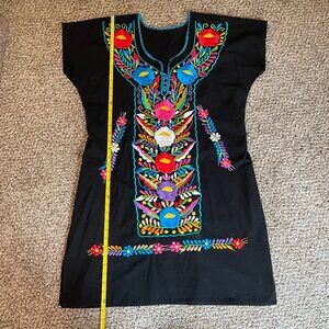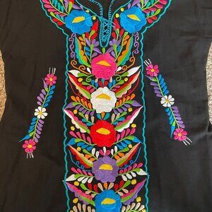 Brand new. Never worn. Size Large black embroidered Mexican dress. Beautiful floral embroidery on black background. V-neck with matching turquoise tie and black ties on back of dress. Handmade with love!