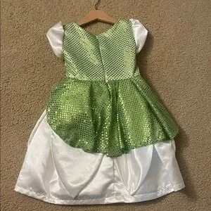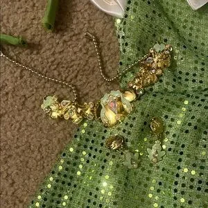 Home sewn Princess Tiana costume for kids, perfect for imaginative play and dress-up. Features sparkling green accents and a charming white bow. Comes with the headdress, a frog (her prince), necklace, and earrings. Items was worn once at oogie boogie bash in 2023.