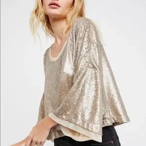 Shimmering gold sequin crop top. Loose fit with wide sleeves. Perfect for a night out.