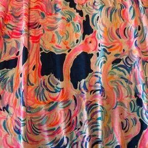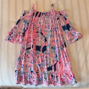 Colorful dress with playful bird feather patterns. Features off-shoulder style and flared sleeves. Perfect for casual wear. New without tags. Girls size XL (12-14). From a smoke-free hypoallergenic dog friendly home.