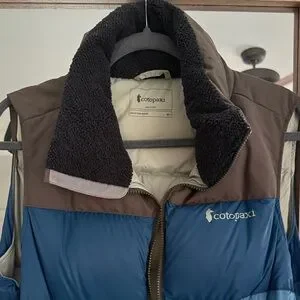 Cotopaxi puffer vest with a two-tone design. Features blue and brown panels. Ideal for outdoor adventures.