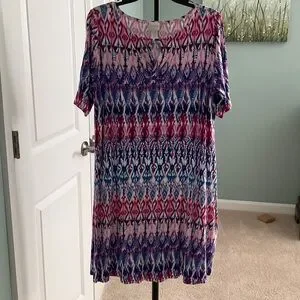 Vibrant multicolor dress. Features geometric patterns. Short sleeves. Perfect for casual outings.