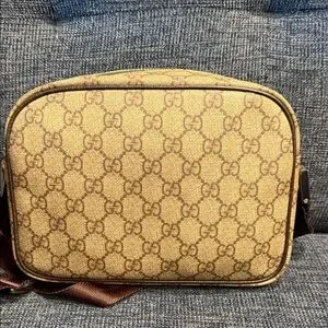 Gucci Supreme Camera Crossbody Bag. This is a vintage bag from the early 2000s and is in unbelievable condition. The brown leather has very little wear, except for one small place on the top and the bottom of the shoulder strap pad. A couple tiny marks on the GG pattern. The zippers work well, but do show some tarnish, and the screws that hold the straps on do show wear. The inside is super clean. Please see all photos approximately 8 1/2 x 6 1/2 x 2.75..