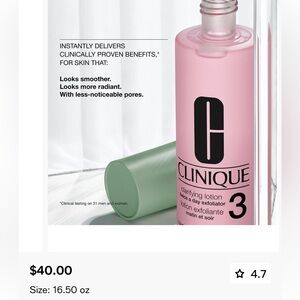 Experience refreshed and revitalized skin with Clinique's Clarifying Lotion Twice a Day Exfoliator. This pink exfoliating lotion gently removes dead skin cells, leaving your skin smooth and radiant. Less than 1/8 used.