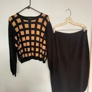 Chic Eloquii sweater skirt set with bold black and tan checkered design. Perfect for a modern look.
