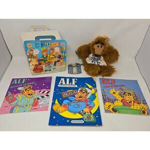 This is a Burger Children's Meal Box for promoting Alf in 1988 which includes one of the Alf Puppets, "Cookin' with Alf" which has Alf in an Apron and Chef's Hat. It also includes three Alf books with a coloring book and two readers.