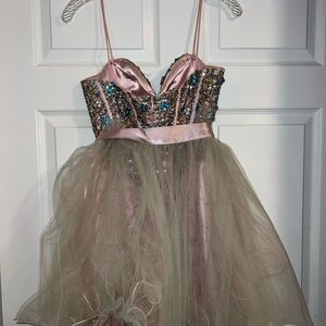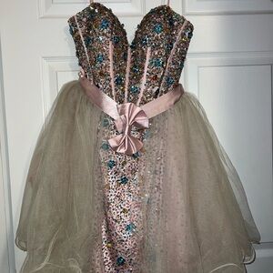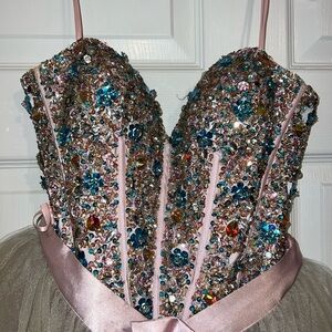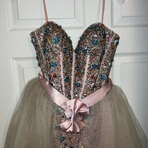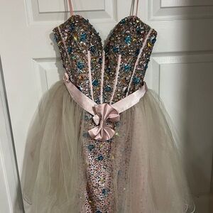 Stunning strapless prom dress by Terani Couture. Features intricate multicolor embellishments. Elegant bow detail at the waist. Flowy tulle skirt adds volume. Excellent condition. Worn only once.